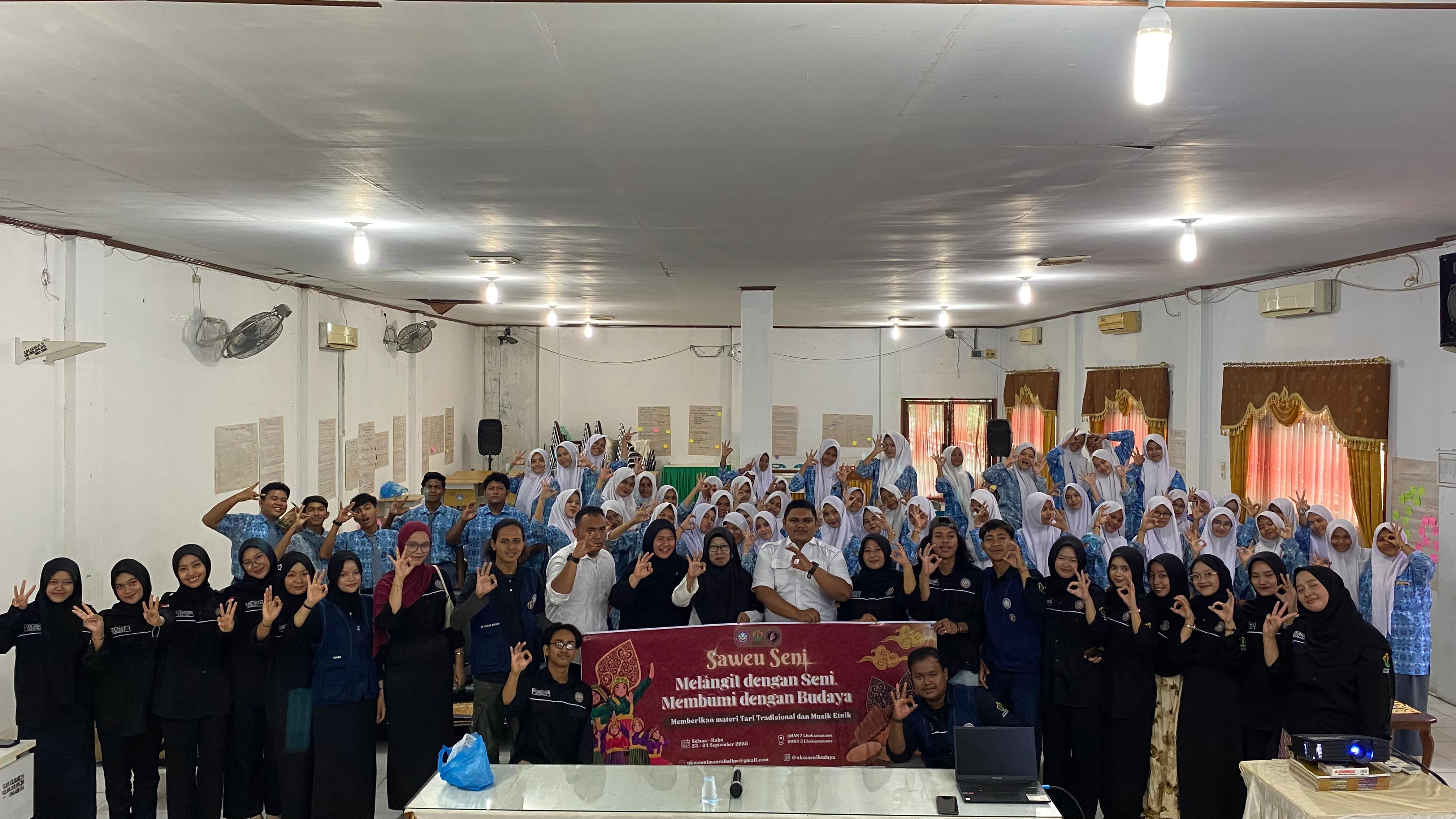UNIMALNEWS | Lhokseumawe – Unit Kegiatan Mahasiswa (UKM) Seni Budaya Meurah Silue Universitas Malikussaleh menggelar kegiatan Saweu Seni di SMA Negeri 7 Lhokseumawe dan SMK Negeri 3 Lhokseumawe selama dua hari, Senin-Selasa (23-24/9/2025).